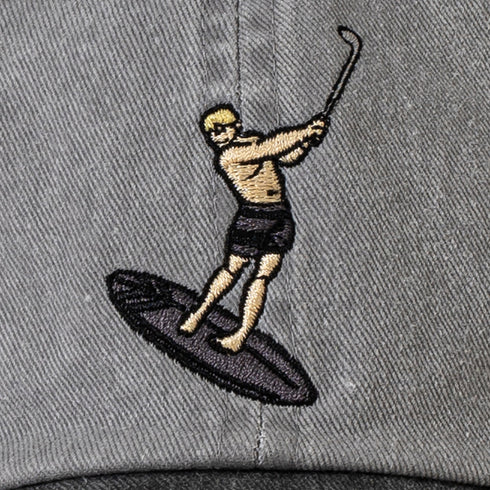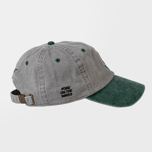 顔料染めされた生地のキャップに、ウォッシュ加工を施したUSED感のあるデザイン。Pacific DRIVE-INでもお馴染み、イラストレーター・FACE氏描き下ろしの、サーフィンをしながらゴルフをするユニークなキャラクターをフロントに刺繍。サイドには「FORE ON THE WAVES」(波に打ち損じてしまった)のメッセージ、バックにはPacificのロゴの刺繍入り。